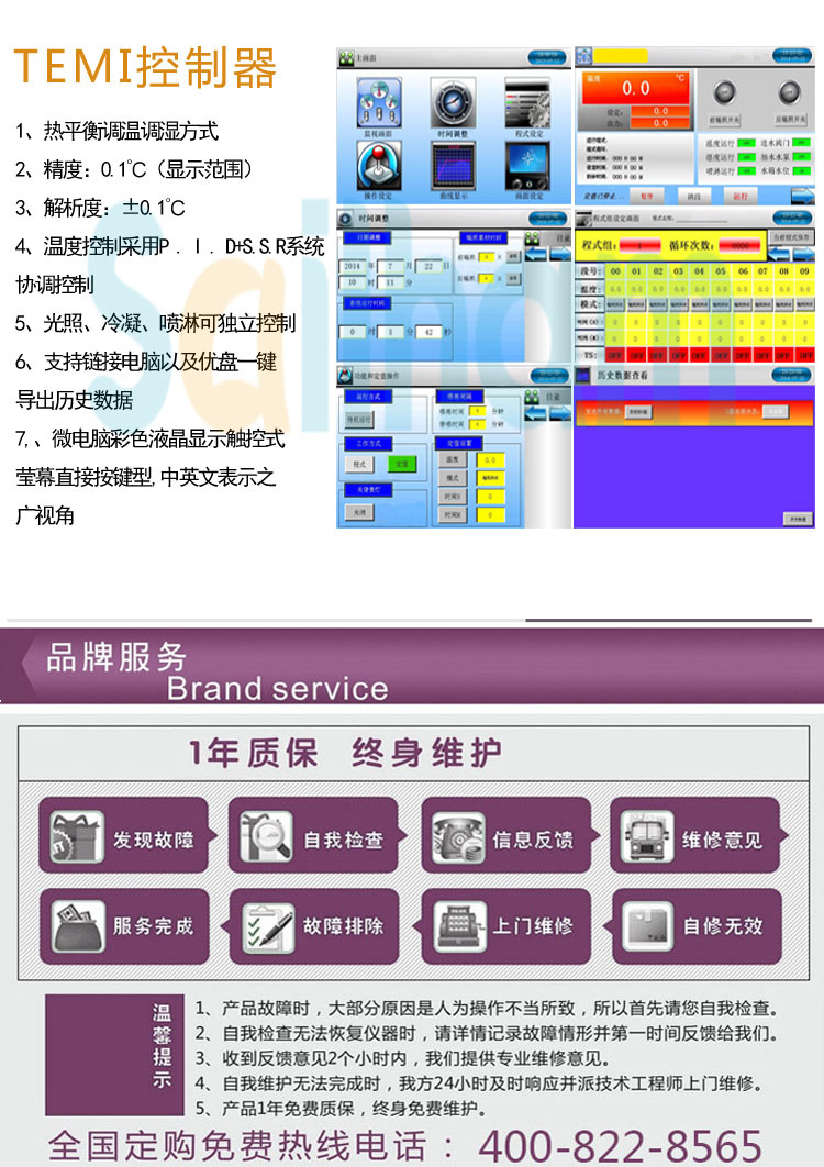 紫外線老化測試機保養及維護1.隨時保持外觀整潔。2.本機頂蓋上請勿放置物品以利馬達及控制零件之散熱。3.若測試物含塵量多時,請視情況清理內部風車室風輪之出風量。4.請經常檢查機臺之固定螺絲是否松動,請固定之。5.請貴公司維護保全人員,